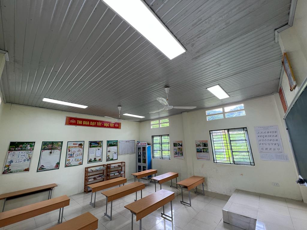 Phòng học được xây mới và lắp đặt đầy đủ bàn ghế, khu hiệu bộ, sân chơi có tường rào và cổng an toàn, cũng như khu vệ sinh riêng cho nam và nữ