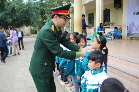 Thượng tá Tăng Bá Tuyên tặng áo cho học sinh trường Tiểu học Lương Mông