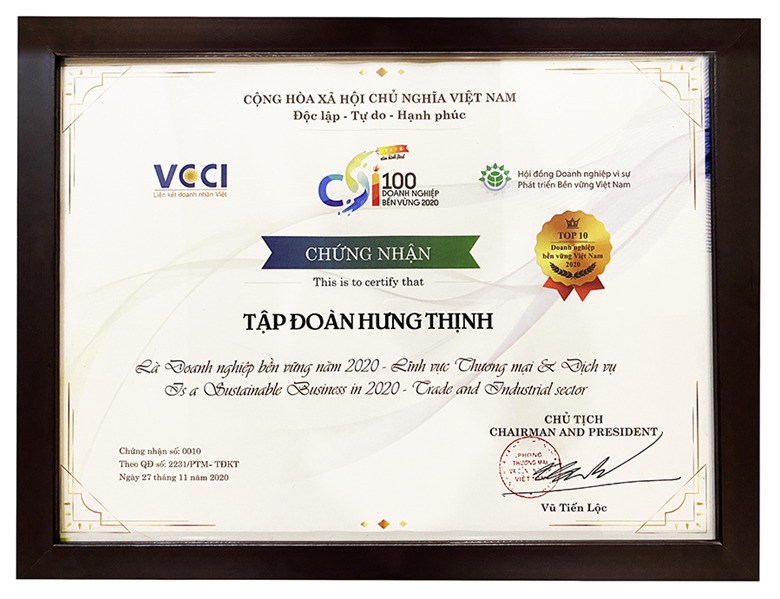 Tối ngày 10/12/2020, trong Lễ công bố các doanh nghiệp bền vững tại Việt Nam năm 2020 (CSI 2020), Tập đoàn Hưng Thịnh đã được vinh danh Top 10 doanh nghiệp bền vững 2020 - Lĩnh vực Thương mại & Dịch vụ.